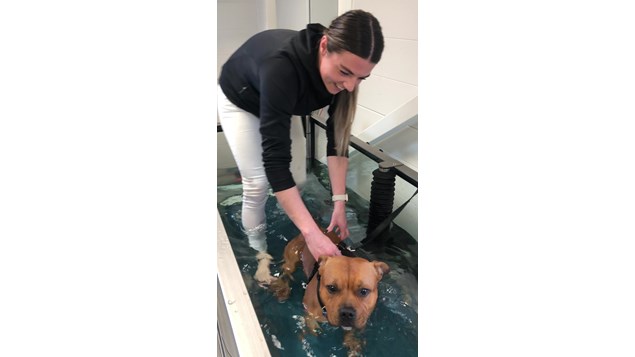 Bluey har en dårlig albue og går derfor til genoptræning og styrke hos vores fys Simone 🏋🏻♀️💪🏻💦 Han kan slet ikke finde roen og balancen til at gå på vores waterwalker , MED MINDRE Simone træn...