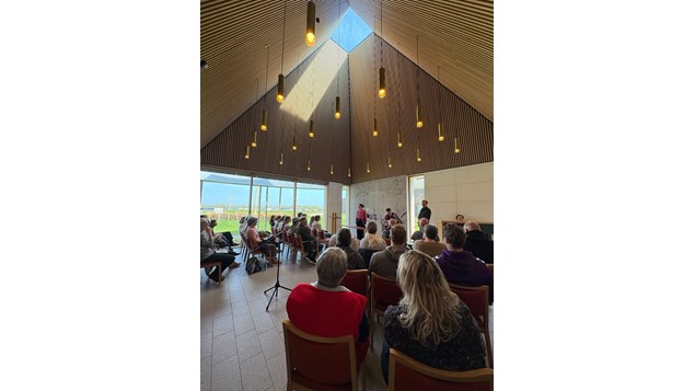 I går besøgte Ensemble MidtVest Regionshospitalet Gødstrup ved Herning og spillede mindfulnesskoncert i hospitalskirken. Med værker af bl.a. Bach, Chopin og Saint-Saëns skabte vi et rum for ro, nærvær og eftertanke – midt i hospitalets hverdag.