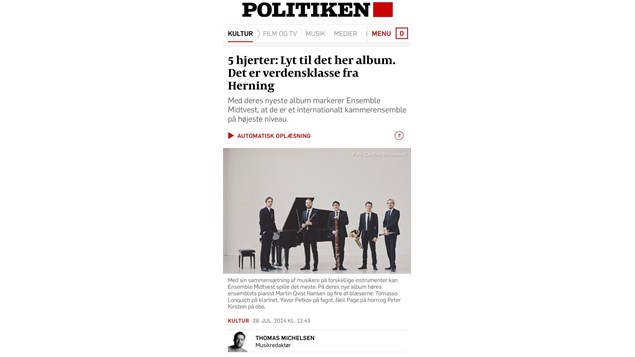 Ensemble Midtvest modtager verdensklasseanmeldelse fra Politiken for nyt album