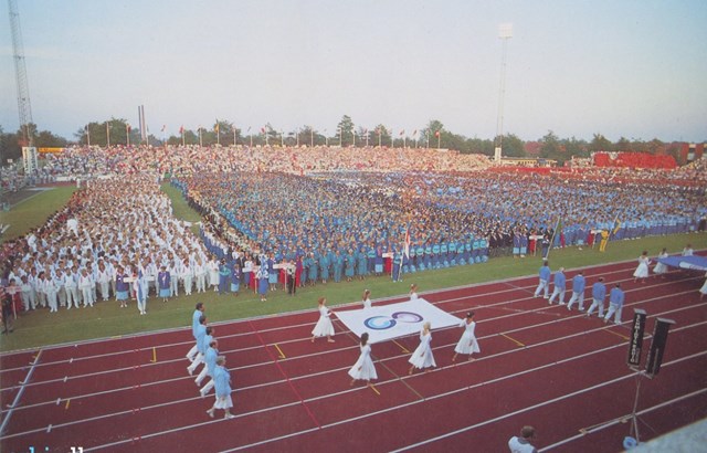 Åbningen af den 8. Gymnaestrada i 1987. En af det store begiveheder, der banede vej for Hernings rige kulturliv, som vi kender det i dag. Foto: arkiv.dk.