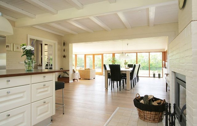 Stort og flot landkøkken med den smukke natur lige udenfor vinduerne (Foto: Peter Hoe Ejendomme)
