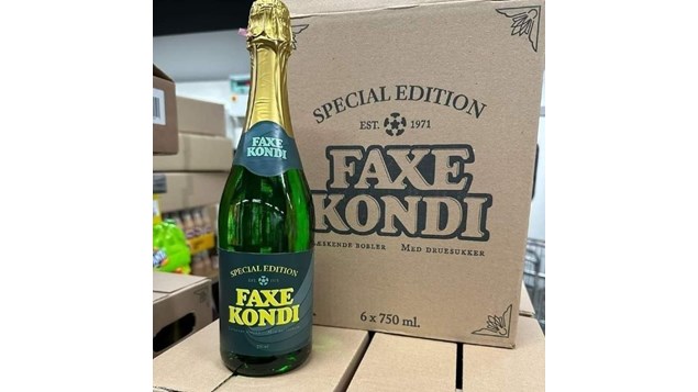 Faxe Kondi i champagneflaske til salg for 30 kr. i SuperBrugsen Hammerum