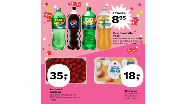 Vær med til at fejre Kvickly og SuperBrugsens fødselsdag med Faxe Kondi eller Pepsi sodavand 15 stk. skrabeæg og jordbær i trækasse