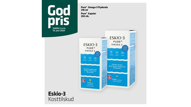 T.o.m. d. 19. juni finder du både flydende fiskeolie og fiskeolie i form af kapsler fra Eskio-3 til en ekstra fordelagtig pris!
