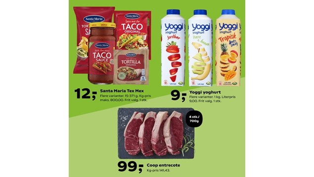 Lækre favoritter venter på dig. Find Yoggi yoghurt Eller hvad med 4 stk entrecot til grillen? Du kan også finde et udvalg af Santa Maria Tex Mex Kom ned i butikken og se de gode priser!