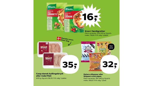 Skal aftensmaden være nem? Så kom ned i butikken og køb Knorr færdigretter, så bliver det ingen sag at få lavet mad Vi har også kyllingbryst eller inderfilet Og få en stor pose Malaco slikpose med til desserten