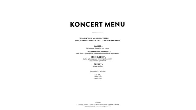 Så har vi et forslag til at gøre aftenen endnu mere speciel! Vores dygtige køkkenteam har sammensat en lækker koncertmenu, der får dine smagsløg til at danse.