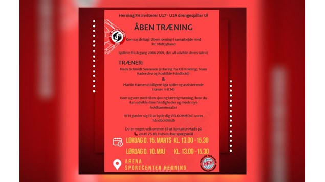 Herning FH åbner dørene for kommende håndboldtalenter med Åben Træning for U17/U19-drenge: Oplev stemningen, mød trænerne og vis dit talent i Arena SportCenter Herning den 15. marts og 10. maj fra 13.00 til 15.30.
