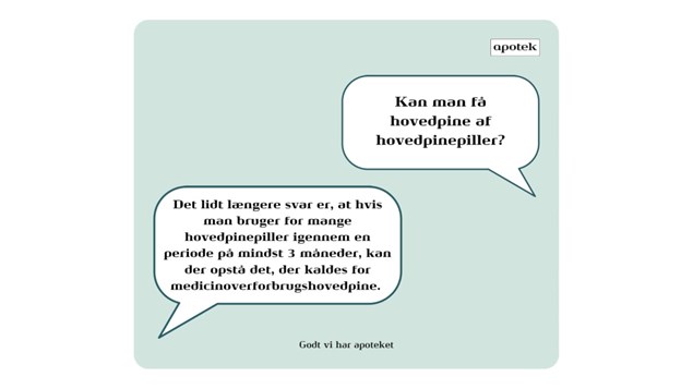 Læs mere om medicinoverforbrugshovedpine på https://lnk.dk/apoteket-dk-medicinoverforbrugshovedpine. Du kan også altid spørge på apoteket, hvis du har brug for råd og vejledning om sundhed, sygdom og medicin