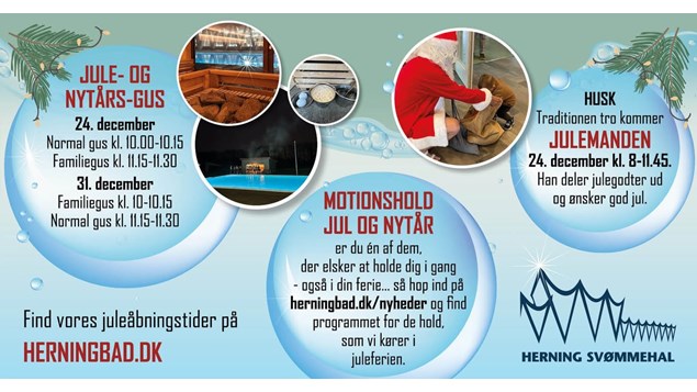 Vil du se vores juleåbningstider og resterende program for julen, så tjek her: https://herningbad.dk/nyheder/jul-og-nytaar-i-herning-svoemmehal-0