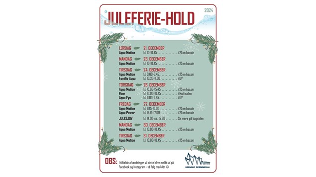 Fra 2. januar kører alle vores motionshold som normalt igen - bemærk, at der er en ny holdoversigt over hold i 2025 på vej ud. Snup en flyer i receptionen eller tjek tiderne her: https://herningbad.dk/holdtider