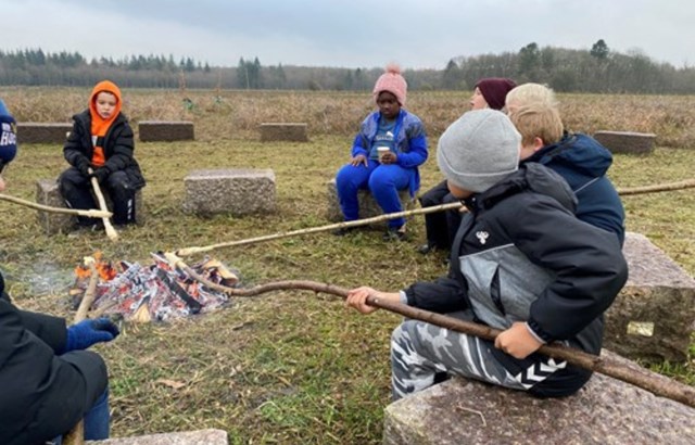 Foto: Herning Kommune // Bålstedet på den nye legeplads blev testet med snobrødsbagning.