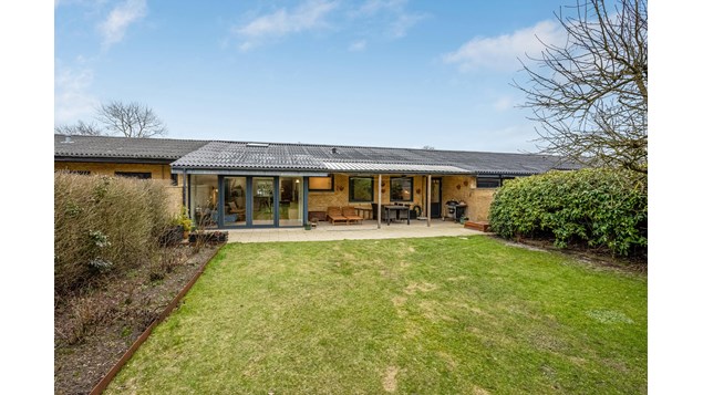 Udenfor finder du en ugeneret sydvestvendt have, der primært er udlagt i græs – perfekt til leg eller afslapning. Den velanlagte terrasse med overdækning giver mulighed for at nyde udendørslivet uanset vejret.