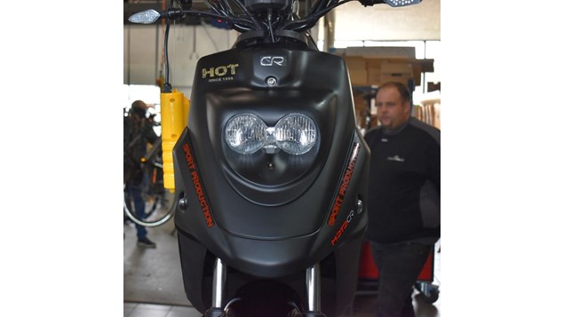 Kasper er ved at gøre en ny scooter klar til en ny kunde. En Hot 50 Naked er snart klar til landevejen. Og endnu en glad kunde ekspederet hos Cykelkram.