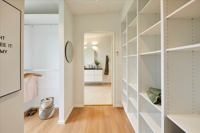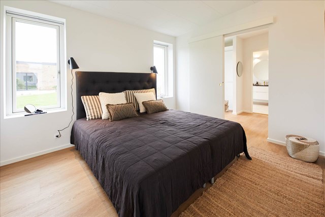 I den modsatte ende finder du husets soveværelsesafdeling med en luksuriøs suite, der inkluderer et soveværelse med walk-in garderobe og et badeværelse med dobbeltbruser.