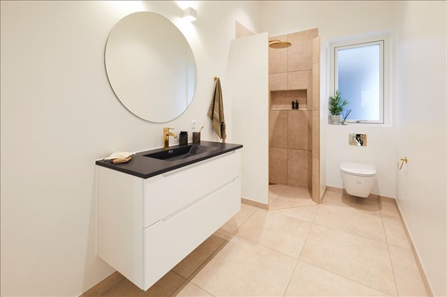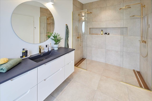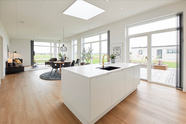 De store vinduespartier og ovenlysvinduet i køkken/alrummet og stuen sikrer et fantastisk lysindfald og forbinder hjemmet med naturen udenfor, med udgang til den overdækkede terrasse. Køkken/alrummet er placeret i midten af huset, og er centrum for familielivet.