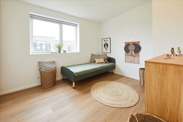 Indvendigt er huset smagfuldt indrettet med en børneafdeling i den ene ende, der består af tre rummelige børneværelser, et badeværelse og et praktisk bryggers.