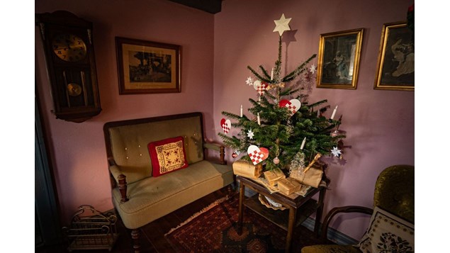 Vi pynter med flettede, rød-hvide julehjerter og skinnende, røde julekugler. Nogle familier har også stadig som tradition at pynte juletræet med ranker af dannebrog.