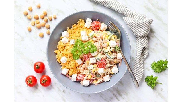 GRØN: Max 15 min.: Paprika-bulgur og fyldig salat med kikærter og salatost (varer fra avisen: Cherrytomater, dagens salat med dressing)