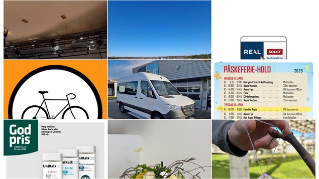 Herning Svømmehal holder påskeferie for deres ugentlige hold, men tilbyder særlige påskeferie-hold. RealMæglerne Herning opfordrer til boligsalg i foråret og tilbyder rådgivning. FREDHØJ CYKLER fremhæver elcyklen Gazelle Avignon og inviterer til en prøvetur. Herning Løve Apotek har et tilbud på Unikalk kosttilskud indtil 23. april. Vestergades Blomster deler forårsstemning med påskebuketter. Museerne i Holstebro tilbyder påskeaktiviteter for hele familien, hvor alle under 26 år får gratis adgang. AutoFit A/S har leveret en Mercedes Sprinter til flextrafik, og EMV har afholdt en afskedskoncert for deres cellist Jonathan Slaatto. Per P. Cykler nyder det gode cykelvejr og ønsker alle en god weekend. For mere information kan du læse de oprindelige opslag.