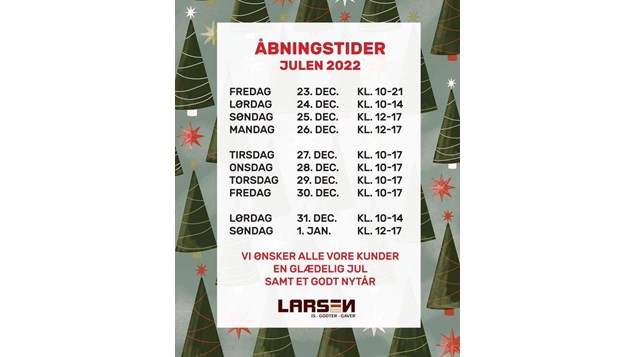 Se hele opslaget på Larsen Vs FacebooksideVi ønsker alle vores kunder en glædelig jul og et godt nytår. Mvh.Inger og Henning