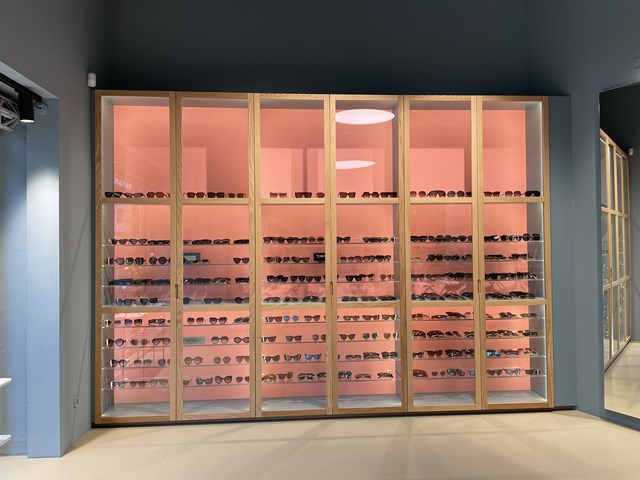 Foto: Seerup Optics // Hos optikeren har de gjort sig umage for at skabe et miljø, hvor der er tænkt over detaljerne - her ses solbrilleskabet, der netop har fået nye låger