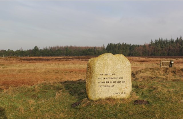 På stenen står der: “Her lå Axelhus eller Kjeltringhuset hvor Blicher for 100 år siden så Kjeltringsballet. Stenen er sat 1917.”