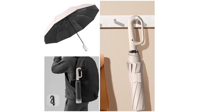 Paraplyen har super smart håndtag udformet som karabin hage