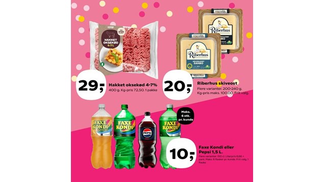 Der er skruet op for prisfesten og ned på prisen - og det betyder også, at der venter lækre favoritter på dig Find hakket oksekød til aftenens hakkebøffer. Eller hvad med Riberhus skiveost til at pife ostemaden op? Du kan også finde Faxe Kondi og Pepsi til at slukke tørsten
