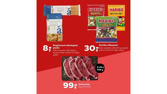 Lækre favoritter venter på dig. Ugens Køb er Änglamark økologisk pasta Du kan også finde entrecot til grillen Eller Haribo slikposer til lækkersulten Kom ned i butikken og se de gode priser!
