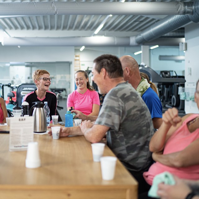Foto: TræningsHuset // I centret kommer medlemmerne hinanden ved i et socialt træningsfælleskab, som her, hvor der nydes en varm kop kaffe efter træningen