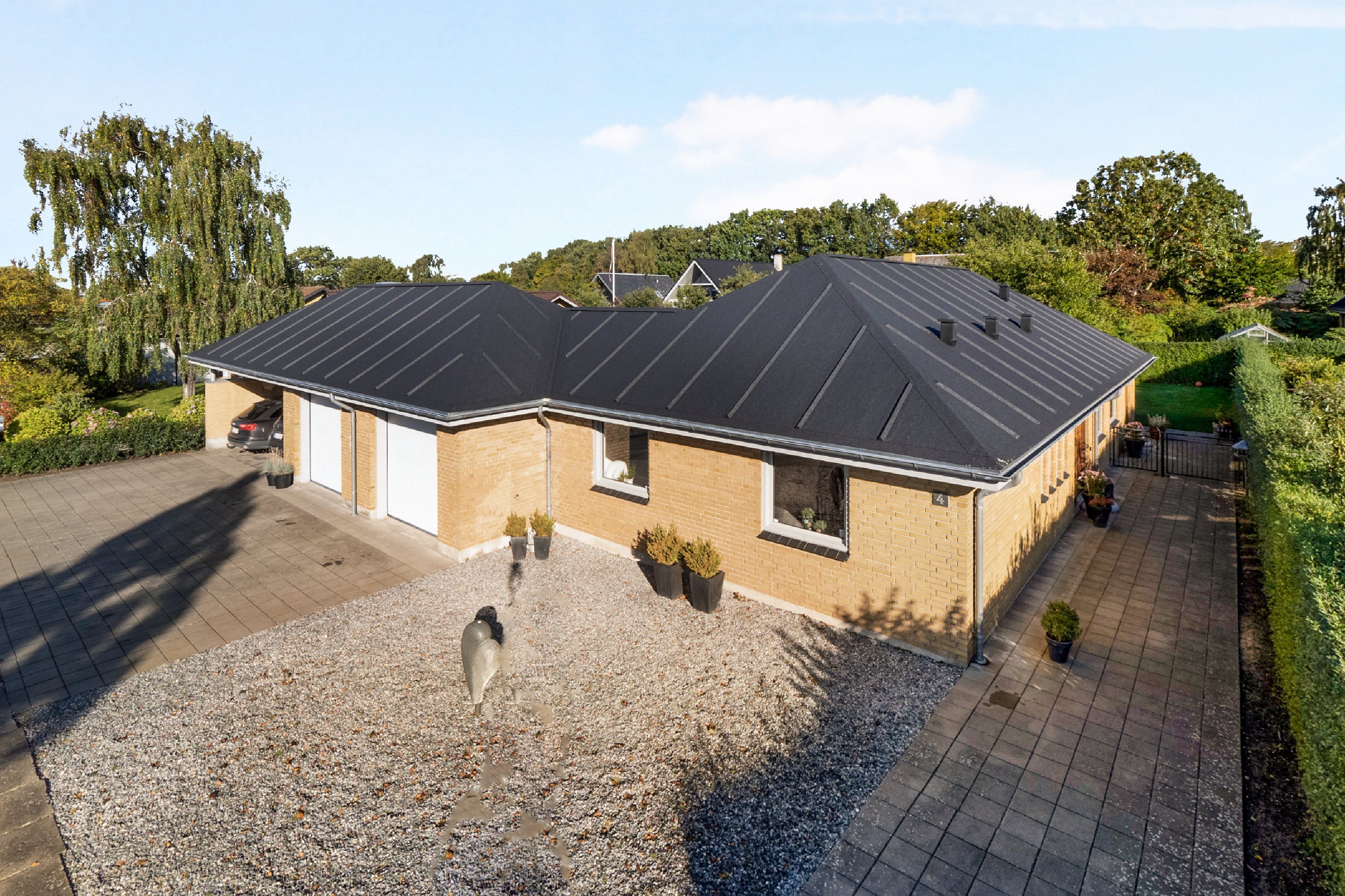 Ad den rolige villavej præsenterer den gule murstensvilla sig flot med det sorte tag fra år 2016 og den minimalistiske indkørsel, der både råder over en dobbelt carport og en dobbelt garage. Her er således masser af plads til både familiens og gæsters køretøjer, og den gode plads fortsætter om i den nordvestvendte have, der smukt omkranses af grønne hække. På den store plæne kan børnene spille bold, eller I kan opsætte trampolin, gyngestativ mm. Derudover kan I om sommeren nyde en rolig stund på den solrige terrasse, mens grillen varmer op.