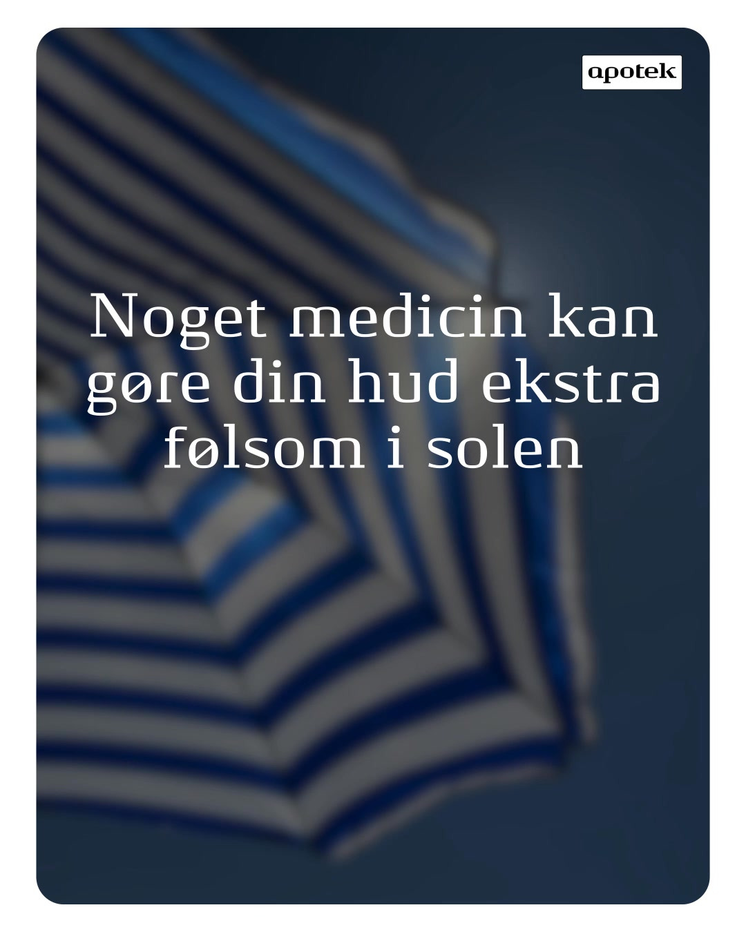 Tjek indlægssedlen, der følger med din medicin, for at se om din medicin kan gøre din hud ekstra lysfølsom. Læs afsnittet om ‘Bivirkninger’. Du kan også altid spørge os på apoteket og få mere viden på apoteket.dk/fotosensitivitet