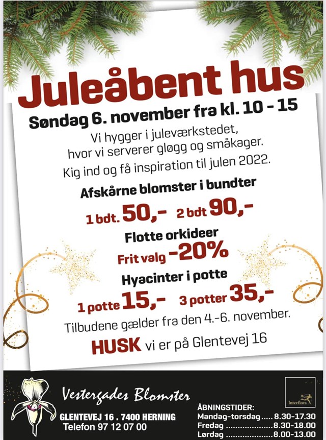 Du finder Vestergades Blomster på Glentevej 16, 7400 Herning. Desuden har de en konkurrence kørende på deres Facebookside, hvor du har mulighed for at vinde en juledekoration til en værdi af 350 kr.